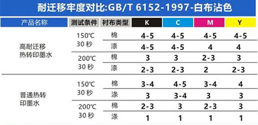 普通熱轉印的產品,在儲運過程中,遇到濕熱條件時,印花織物纖維內部的染料分子發生遷移,從而形成搭色,產生疵品,尤其是一些高端面料或外貿訂單,成本高,一旦出現此類疵品,勢必會造成不小的損失。鴻盛數碼為了解決這方面客戶的困惑,推出了鴻美®高耐遷移牢度熱轉印墨水。