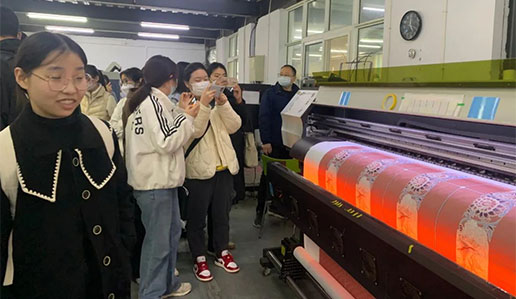 參加揭牌儀式的同學(xué)們參觀了鴻盛展廳、測(cè)試中心、應(yīng)用中心等,直觀地了解了數(shù)碼印花的整個(gè)打印過(guò)程及各種不同材質(zhì)的打印應(yīng)用,了解了印花科技的發(fā)展、印染行業(yè)的進(jìn)步。