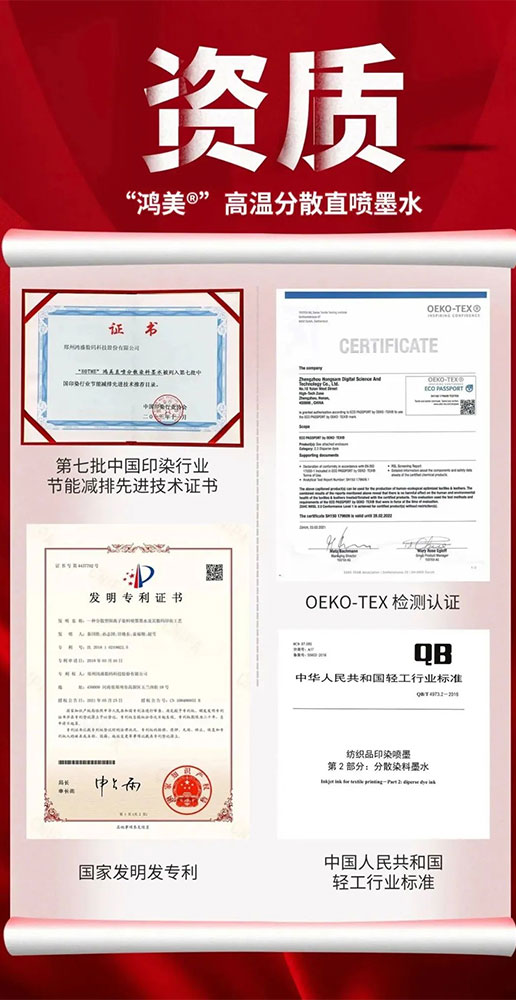 此次的測試成功,也給還在觀望的設備廠商打消了顧慮,從墨水的流暢性及兼容性來講,是完全達到官方的要求。從實際應用中,鴻盛數碼高溫分散直噴染料墨水已成功應用于多種工業噴頭。