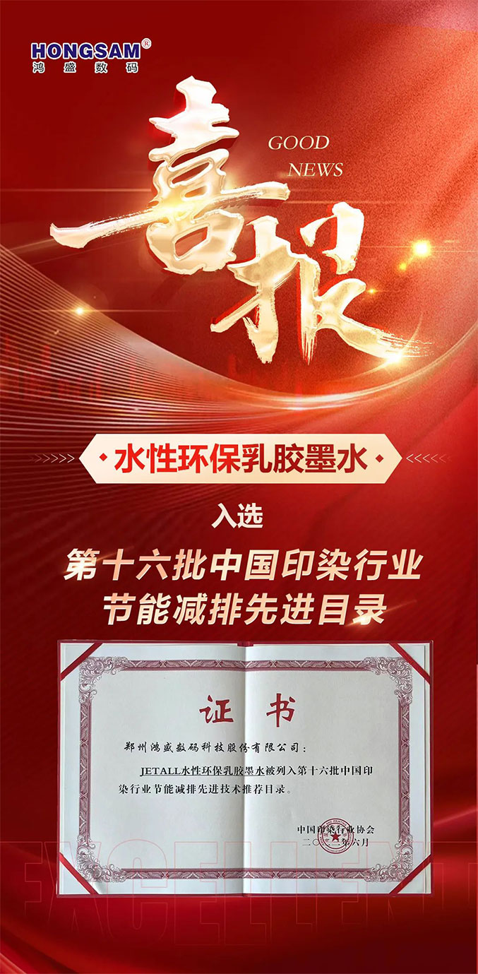 喜報(bào)丨鴻盛“絲美特®”酸性染料墨水被列入第十二批中國印染行業(yè)節(jié)能減排先進(jìn)技術(shù)推薦目錄鴻盛環(huán)保水性乳膠墨水 | 跨越行業(yè)應(yīng)用邊界