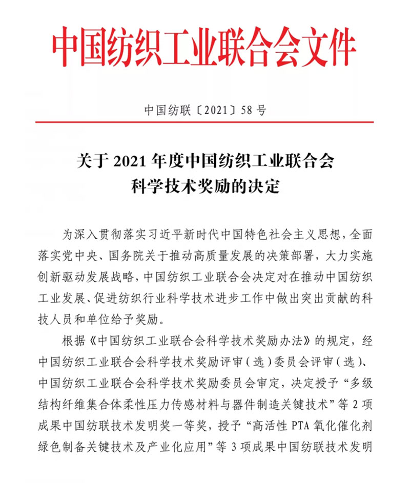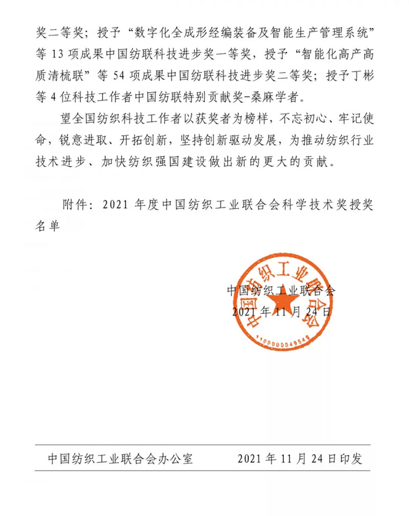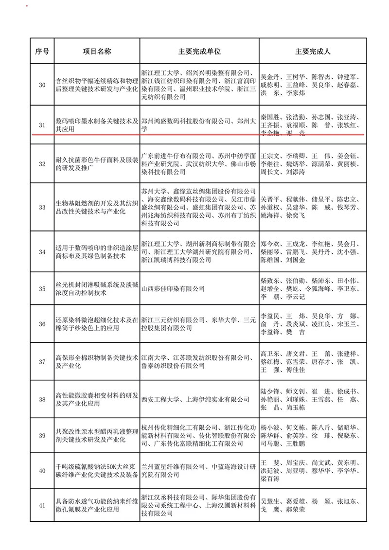 近日,中國(guó)紡織工業(yè)聯(lián)合會(huì)科技發(fā)展部網(wǎng)站發(fā)出通知——《關(guān)于 2021 年度中國(guó)紡織工業(yè)聯(lián)合會(huì)科學(xué)技術(shù)獎(jiǎng)勵(lì)的決定》(中國(guó)紡聯(lián)【2021】58號(hào))。《決定》顯示,2021年,全國(guó)共有76個(gè)項(xiàng)目獲得了獎(jiǎng)勵(lì),其中技術(shù)發(fā)明獎(jiǎng)5項(xiàng),科技進(jìn)步獎(jiǎng)67項(xiàng),桑麻學(xué)者4位。鴻盛數(shù)碼和鄭州大學(xué)合作的“數(shù)碼噴印墨水制備關(guān)鍵技術(shù)及其應(yīng)用”獲得科技進(jìn)步二等獎(jiǎng)。