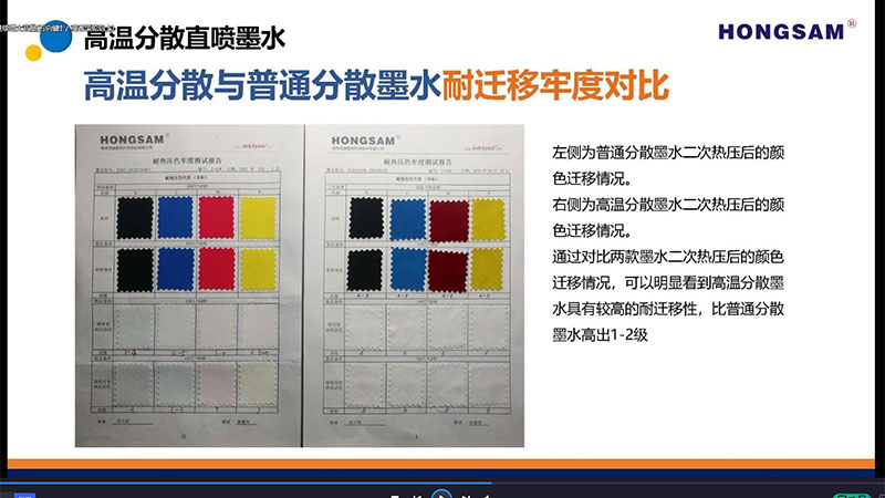 高溫分散染料墨水具有優(yōu)異的色牢度等優(yōu)點(diǎn),能夠很好解決熱轉(zhuǎn)印工藝不耐高溫、色遷移牢度差等問(wèn)題,避免集裝箱長(zhǎng)途運(yùn)輸過(guò)程中或在成衣熨燙過(guò)程中發(fā)生二次升華搭色等情況造成的巨大損失。