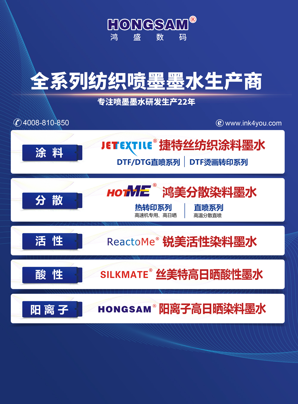 中國國際紡織機(jī)械展覽會暨ITMA亞洲展覽會將于2023年11月19-23日在國家會展中心(上海)舉辦。鴻盛數(shù)碼是專業(yè)研發(fā)生產(chǎn)噴墨墨水22年的高新技術(shù)企業(yè),作為多項(xiàng)噴墨標(biāo)準(zhǔn)的起草單位,榮獲中國紡織工業(yè)聯(lián)合會科技進(jìn)步二等獎(jiǎng)、專精特新企業(yè)、是全系列紡織噴墨墨水開創(chuàng)者,是捷特絲紡織涂料墨水(匹布直噴墨水、DTG裁片直噴墨水、DTF燙畫墨水)、鴻美分散染料墨水(高溫分散墨水、高耐日曬熱轉(zhuǎn)印墨水、各種分散直噴墨水)、銳美活性染料墨水(可以提供高濃與標(biāo)準(zhǔn)款)、絲美特高日曬酸性染料墨水一系列墨水發(fā)明專利持有者,并都有被中國印染行業(yè)協(xié)會錄入《中國印染行業(yè)協(xié)會節(jié)能減排先進(jìn)技術(shù)推薦目錄》,其中涂料墨水與高溫分散墨水在匹布直噴市場上占有率遙遙領(lǐng)先,贏得國內(nèi)外客戶的良好口碑,HONGSAM陽離子染料墨水也是行業(yè)應(yīng)用產(chǎn)品中佼佼者,鴻盛紡織系列墨水遠(yuǎn)銷國內(nèi)外120+國家和地區(qū),為廣大合作企業(yè)提供優(yōu)質(zhì)產(chǎn)品與服務(wù)。本次將攜旗下多款產(chǎn)品及方案參展,鴻盛數(shù)碼期待與您相遇!