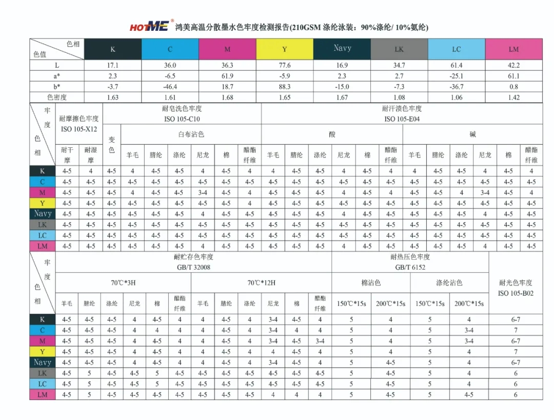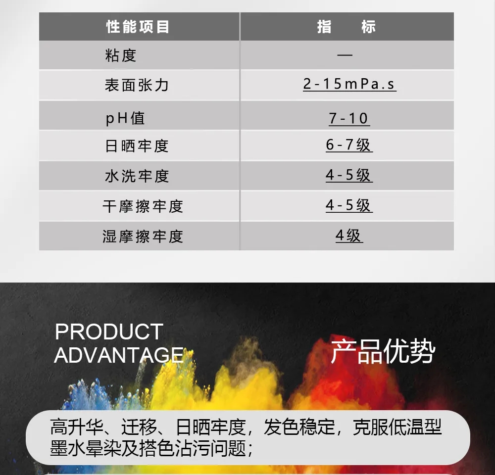 1.高升華、遷移、日曬牢度,發(fā)色穩(wěn)定,克服低溫型墨水暈染及搭色沾污問題;