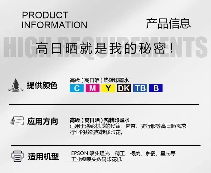 鴻盛數(shù)碼的墨水產(chǎn)品針對(duì)日曬牢度要求高的客戶,提供了獨(dú)特的“鴻美?”高日曬分散墨水,常規(guī)20小時(shí)日曬牢度測(cè)試可以達(dá)到耐日曬牢度6級(jí)以上,針對(duì)更高的客戶要求,比如超長時(shí)間的160小時(shí)日曬,可以滿足瑞典宜家家居要求的5-6級(jí)日曬牢度標(biāo)準(zhǔn),適合出口訂單及高端應(yīng)用需求。