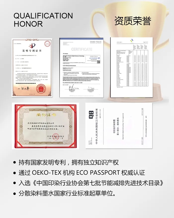 近年來,各國政府與消費(fèi)者的生態(tài)環(huán)保意識(shí)越來越強(qiáng),越來越注重從生態(tài)的角度來看待紡織品的安全性,要求紡織品和服裝達(dá)到“生態(tài)、健康、安全”的標(biāo)準(zhǔn),同時(shí),紡織品經(jīng)銷商也深刻認(rèn)識(shí)到,向消費(fèi)者說明并保證紡織品生態(tài)安全性的迫切性和必要性。鴻盛數(shù)碼符合Oeko-Tex Standard 100標(biāo)準(zhǔn)的墨水產(chǎn)品,幫助越來越多的數(shù)碼印花機(jī)廠爭取到了客戶訂單。