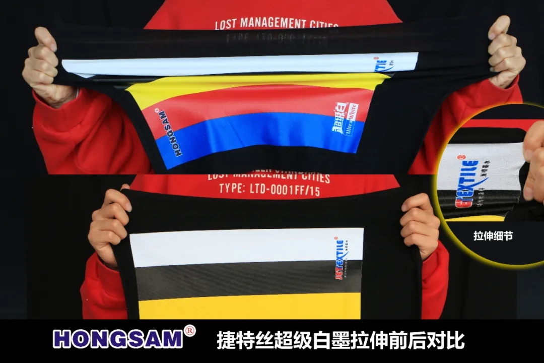 捷特絲紡織涂料“UltraWhite超白”白墨亮相,白度更白,具有優異的成膜延展性,耐刮擦,各項牢度指標符合國內國際紡