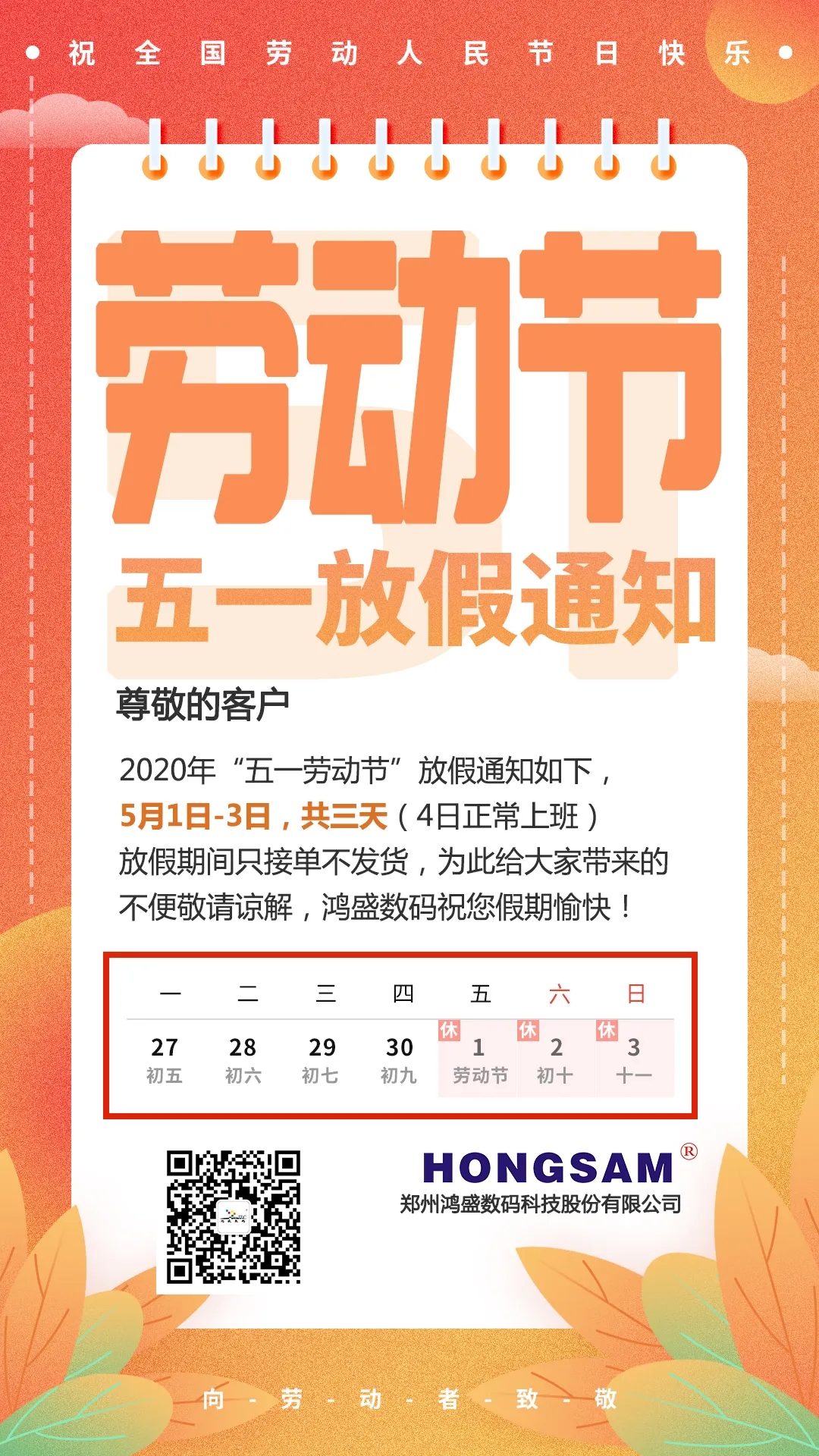 鴻盛數(shù)碼五一小長假放假通知如下