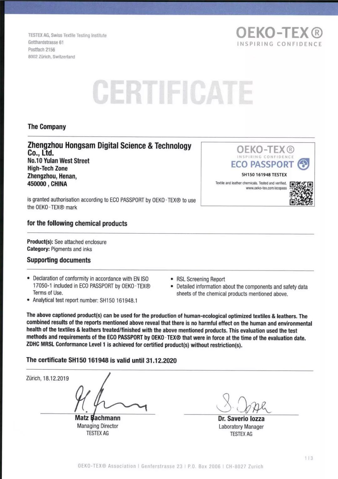 這表明:鴻盛數(shù)碼捷特絲®(Jettextile®)墨水完全符合歐盟紡織品生態(tài)環(huán)保要求,獲得了歐盟綠色環(huán)保通行證。