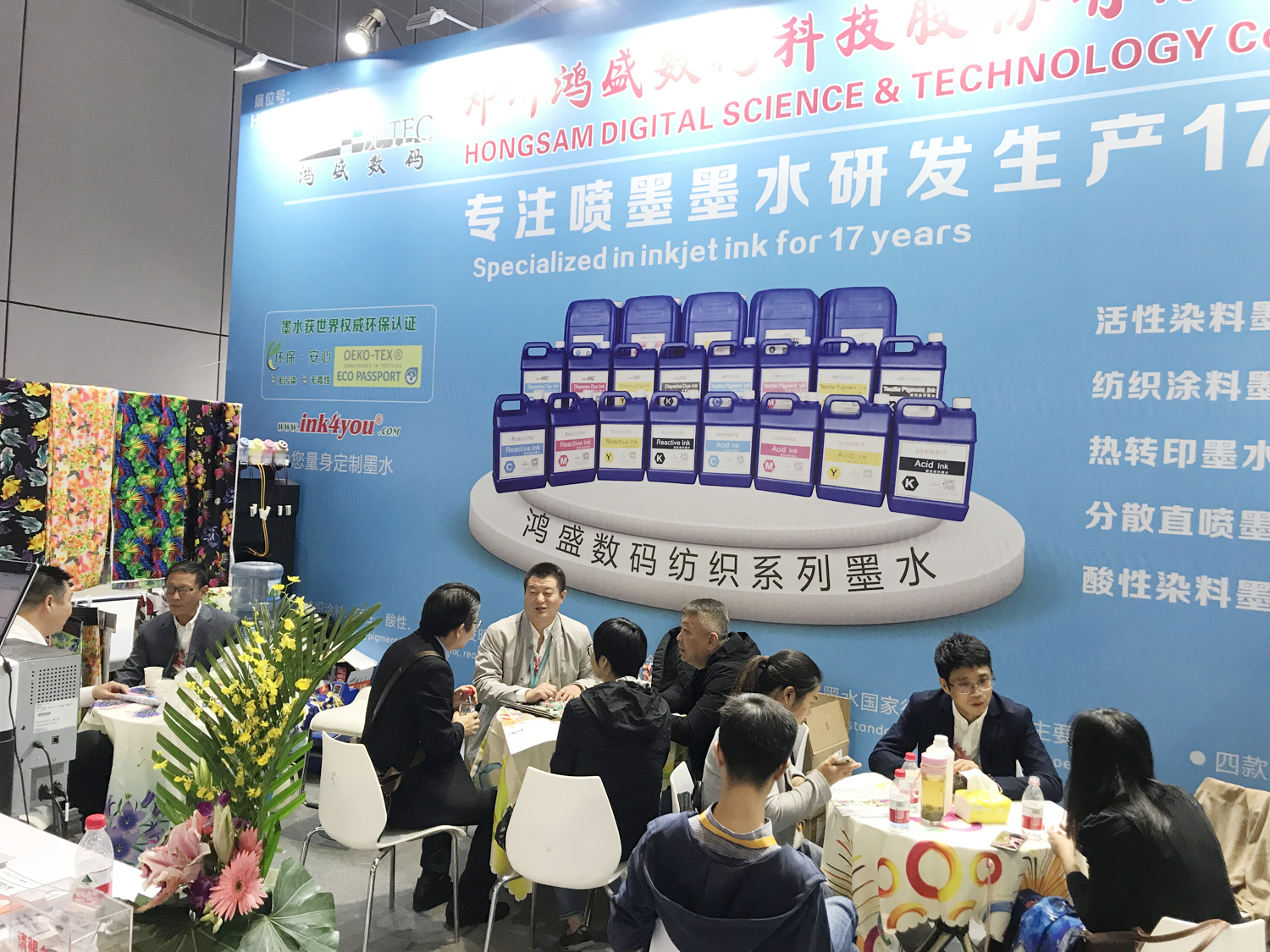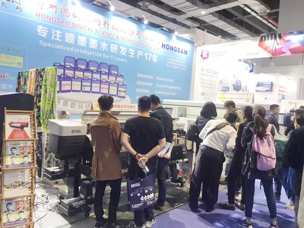 鴻盛數碼從分散染料、行業痛點,著色工藝等方面入手,根據市場需求細分分散種類,推出“高日曬熱轉印/分散墨水”“高溫直噴分散墨水”“高溫分散HF型免水洗墨水”滿足不同印花需求客戶;本次現場展示“鴻美®”高溫分散染料墨水擁有極高的升華度及耐遷移牢度,有效避免了發色過程中的面料污染,適合戶外應用及高端外貿出口并需要二次高溫定型的滌綸面料成品。