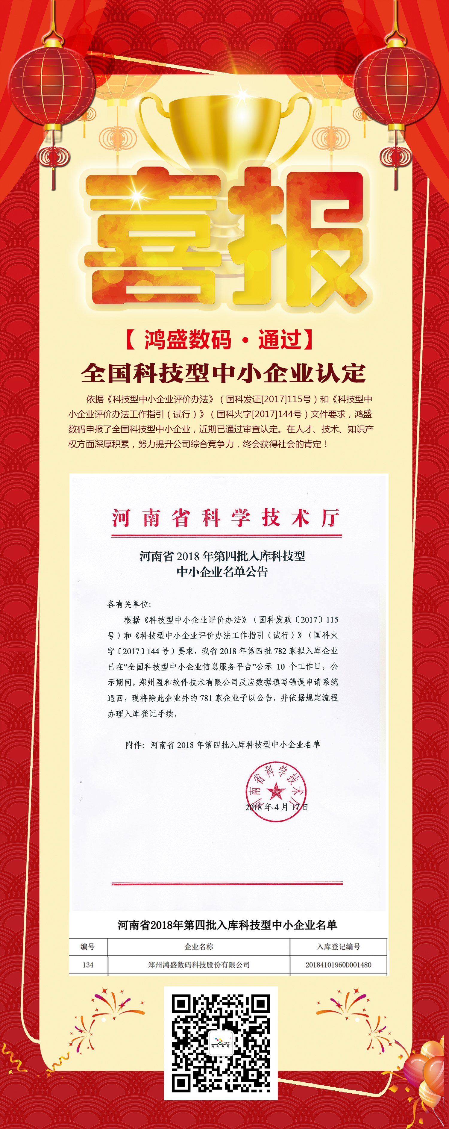 依據(jù)《科技型中小企業(yè)評價辦法》(國科發(fā)證[2017]115號)和《科技型中小企業(yè)評價辦法工作指引(試行)》(國科火字[2017]144號)文件要求,鴻盛數(shù)碼申報了全國科技型中小企業(yè),近期已通過審查認(rèn)定。在人才、技術(shù)、知識產(chǎn)權(quán)方面深厚積累,努力提升公司綜合競爭力,終會獲得社會的肯定!