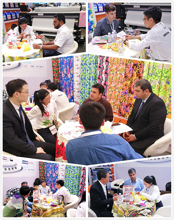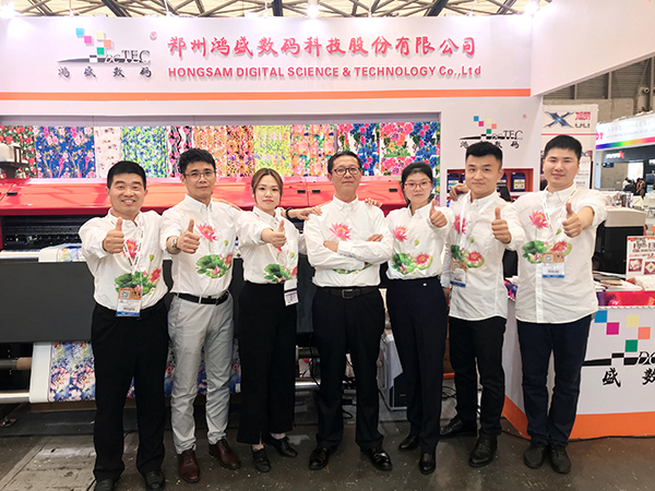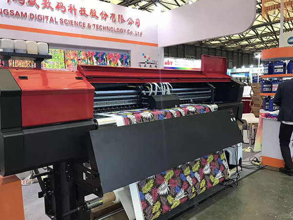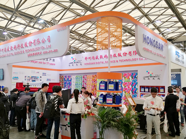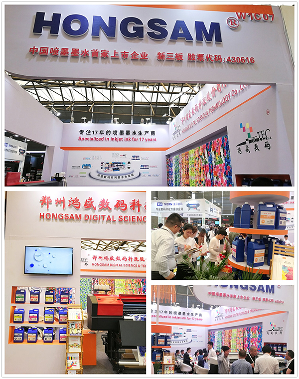 展會現場,鴻盛數碼“鴻美”高日曬熱轉印墨水配套EPSON4個5113噴頭數碼機,現場演示打印效果,色彩精湛,流暢性好。高日曬熱轉印墨水在日曬牢度和耐遷移度方面進行了細致研究,高日曬牢度,相對較好的遷移牢度,色彩艷麗、飽和度高,受到目前進出口紡織品和熱轉印客戶的青睞。