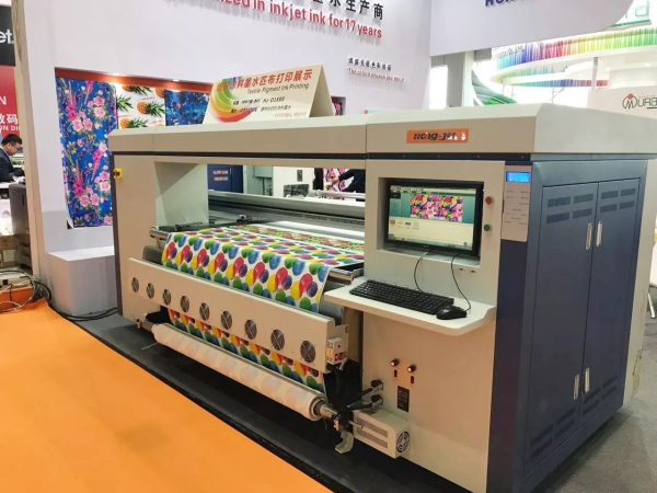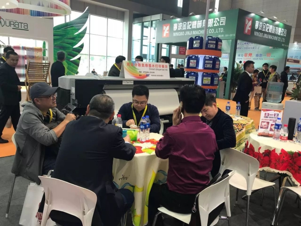 現場捷特絲紡織涂料墨水配套HJ-D1800打印純棉匹布展示,“捷特絲”紡織涂料墨水作為鴻盛數碼紡織墨水中的“亮劍”產品,一直備受行業人士關注和認可,此次展會期間,更有多家行業領先的數碼印花設備生產商集聚鴻盛數碼展臺,謀求合作,鴻盛展臺熠熠生輝。另,“捷特絲”紡織涂料墨水在CVC面料、PU皮革、20D尼絲紡等面料也有精彩優異的表現!很多客戶慕名而來,索要布樣。
