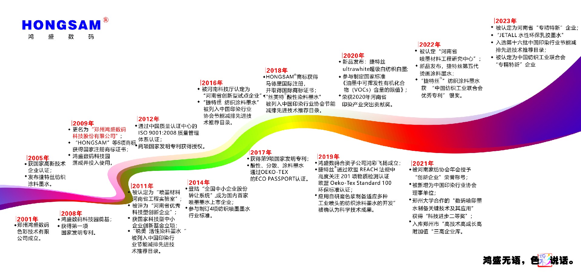 鄭州鴻盛數碼科技股份有限公司成立于2001年,是一家專注噴墨墨水研發、生產、銷售的國家高新技術企業,噴墨行業中國新三板掛牌企業(股票代碼430616),公司自成立以來,始終致力于數碼噴墨技術的研究、開發及應用推廣,開發、生產適應數碼噴墨技術進步的功能性、環保型噴墨墨水,并向客戶提供數碼噴墨印刷整體解決方案和服務。