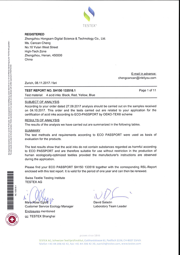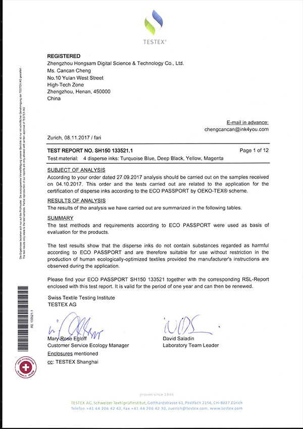 鴻盛數碼紡織類墨水四大金剛(紡織涂料 分散 活性 酸性)中的2員再添喜訊,2017年11月08日,“絲美特”酸性染料墨水和“鴻美”分散墨水均通過了瑞士TESTEX的嚴苛認證,整整數十頁的檢測項目,為了客戶安心,用戶放心。