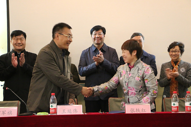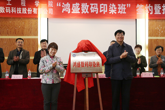 隨后,在現(xiàn)場熱烈的掌聲中,河南工程學(xué)院材料與化學(xué)工程學(xué)院院長和鴻盛數(shù)碼張軼紅簽署了“鴻盛數(shù)碼印花班”合作協(xié)議,河南工程學(xué)院黨委副書記耿廣智和鴻盛數(shù)碼董事張軼紅共同為“鴻盛數(shù)碼印染班”揭牌。