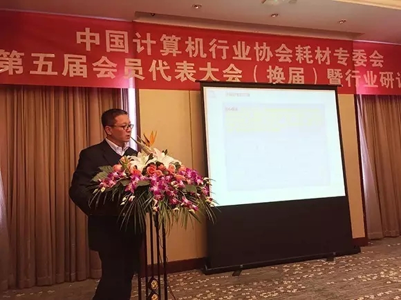 2016年12月16日,中國計算機行業協會耗材專委會第五屆會員代表大會(換屆)暨行業研討會在杭州召開,鴻盛數碼董事長秦國勝參加會議并作了《數碼印花產業的環保驅動力》的專題演講
