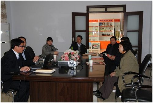 河南省發改委高技術產業處黨迎建副處長(右一)聽取鴻盛數碼董事長秦國勝(左一)做的鴻盛發展概況的講解,并一起研討鴻盛數碼今后的工作重點。