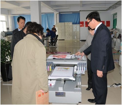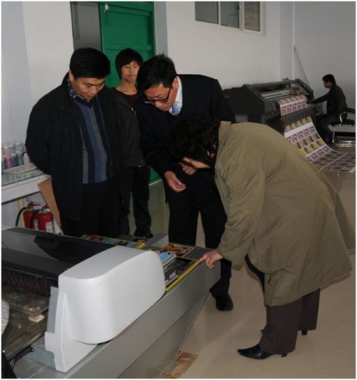 河南省發改委高技術產業處黨迎建副處長(左一)聽取了鴻盛數碼董事長秦國勝(右一)關于鴻盛墨水應用情況的講解。