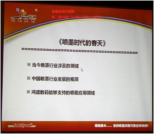 噴墨時代的春天”。演講的主要內容為:當今噴墨行業涉及的領域、中國噴墨行業發展的瓶頸、鴻盛數碼能夠支持的噴墨應用領域。