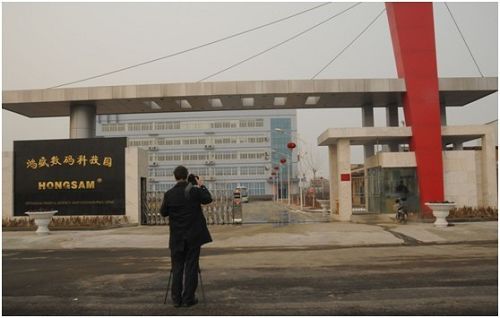 鴻盛數(shù)碼董事長秦國勝先生(左)陪同Dr.Nicholas Hellmuth(右)步入廠區(qū)。映入眼簾的是公司的中英文全稱和“科學(xué)、誠信、超越、環(huán)保”的企業(yè)理念墻。