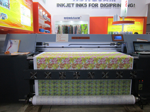 數(shù)碼噴墨印花已然風(fēng)靡全球,HJ-T4160A配合“捷特絲®”二代紡織涂料墨水,在2013廣州國(guó)際廣告標(biāo)識(shí)展,現(xiàn)場(chǎng)直噴純棉坯布印花,讓現(xiàn)場(chǎng)觀眾體驗(yàn)了無(wú)水?dāng)?shù)碼噴墨印花的潮流。HJ-T4160A是一款生產(chǎn)型、工業(yè)化匹布高速數(shù)碼印花機(jī),使用鴻盛活性、酸性、涂料、分散等數(shù)碼印花墨水,滿足各種面料的印花需求。HJ-T4160A采用打印傳動(dòng)系統(tǒng),以及專業(yè)的導(dǎo)帶面料傳送系統(tǒng),而且可以根據(jù)印花圖案的要求,配置墨水顏色數(shù),保證高精度、高品質(zhì)的印花輸出效果。在2013廣州國(guó)際廣告標(biāo)識(shí)展鴻盛展區(qū),HJ-T4160A導(dǎo)帶式數(shù)碼印花機(jī)使用色澤鮮艷、環(huán)保穩(wěn)定的“捷特絲®”二代紡織涂料墨水,以其對(duì)印花色彩和質(zhì)感的高品質(zhì)呈現(xiàn),為現(xiàn)場(chǎng)觀眾譜寫潮流數(shù)碼印花的華麗樂章!
