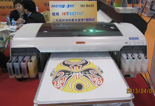 “捷特絲®”二代紡織涂料墨水直噴T恤印花方案是鴻盛數碼推出的全新無水數碼印花方案,在2012年印染行業年會中就得到行業人士的一致認可。HJ-8420超乎想象的打印速度、標準的工業設計模塊,配合綠色環保的“捷特絲®”二代紡織涂料墨水,打造方便快捷、節約環保的數碼直噴方案。“捷特絲®”紡織涂料墨水在印花牢度、色系、色彩等方面都進行了改進,而且滿足了客戶對特殊色光的要求,適合所有織物的直接噴印。2013北京廣告展,鴻盛數碼現場操作演繹“捷特絲®”二代紡織涂料墨水直噴T恤印花,續寫T恤經典文化,展現新一代人們個性化生活的年代縮影。