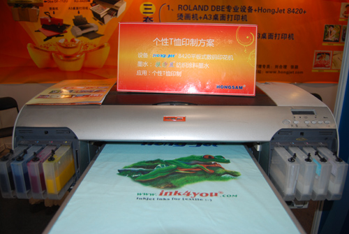 2. HongJet 8420+燙畫機+A3桌面打印機:適合初創業人員,對場地無要求,為團體項目服務。此方案采用HJ-8420,配合“捷特絲®”第二代紡織涂料墨水,為印染行業用戶提供方便快捷的無水數碼直噴印花方案。此服務項目主要適合時尚箱包、個性鞋材、個性T恤等純棉打印、直噴板材、數碼產品制作。另外燙畫機+EPSON A3桌面噴墨打印機,采用“鴻美?”二代熱轉印墨水,主要制作個性水晶、個性杯子、運動服、泳裝、鼠標墊等化纖印花。