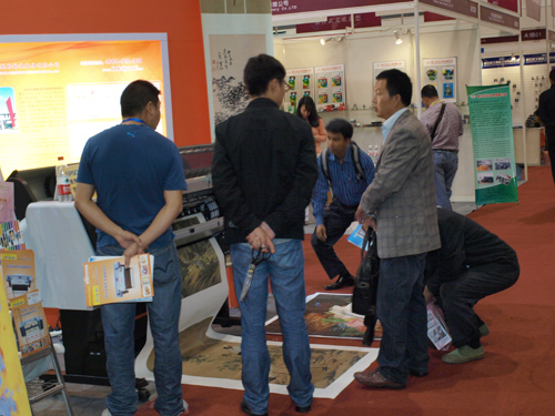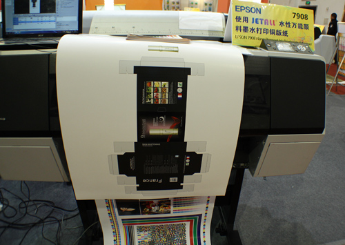 EPSON 7908使用“JETALL®”水性**顏料墨水打印銅版紙對于數碼印刷行業用戶已經不陌生了?!癑ETALL®”環保水性**顏料墨水是一款創新技術的水性無涂層介質直噴打印墨水,專業用于銅版紙印前打樣技術,且墨水的高飽和度、高穩定性、高色彩還原性,快干、防潮,穩定流暢,滿足了數碼打樣專業的苛刻要求。第八屆文博會現場,鴻盛數碼演示了“JETALL®”水性**顏料墨水打印銅版紙以及一些裝飾材料,現場觀眾都興趣高漲,表達了強烈的投資意向。