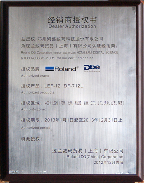 2013年1月1日起,鄭州鴻盛數(shù)碼科技股份有限公司被授權(quán)為邏蘭數(shù)碼貿(mào)易(上海)有限公司認(rèn)證銷售商,為華北區(qū)引進(jìn)高精度噴墨打印技術(shù),繼續(xù)堅(jiān)持在大型噴墨寫真打印領(lǐng)域的發(fā)展,立志成為世界知名的數(shù)碼印刷系統(tǒng)方案提供商。