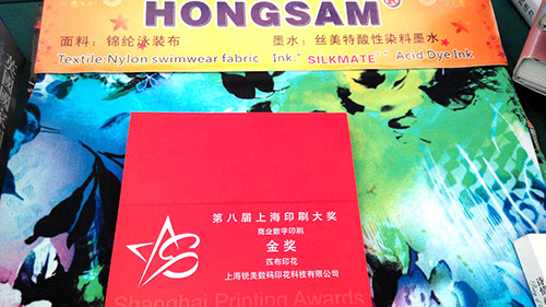 上海銳美選送的“匹布印花”采用鴻盛絲美特酸性染料墨水噴墨打印錦綸泳裝布,圖案顏色鮮艷、色彩亮麗,面料柔軟,具備制作精良、畫面清晰、耐洗牢度高等特點,是數字印刷在紡織面料上的應用的新突破,將在紡織印染領域掀起一場新的革命!“匹布印花”也因此榮獲本屆“上海印刷大獎”商業數字印刷金獎!