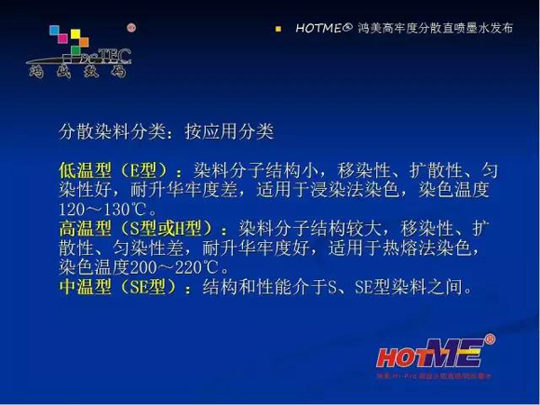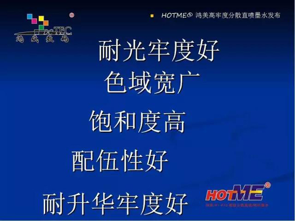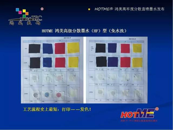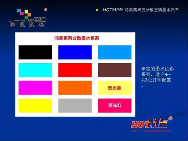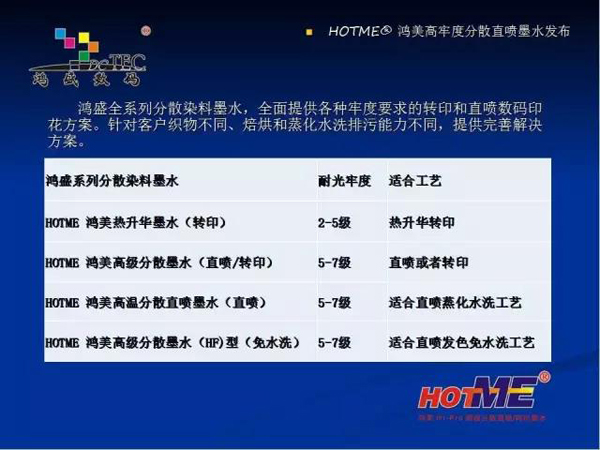 現(xiàn)在鴻盛數(shù)碼推出的有四款分散墨水:分別是熱轉(zhuǎn)印墨水,高日曬熱轉(zhuǎn)印 / 分散直噴墨水,高溫分散直噴墨水,HF 型(免水洗)分散直噴墨水。適合在滌綸、可染滌綸、丙綸上的數(shù)碼印花。下面重點