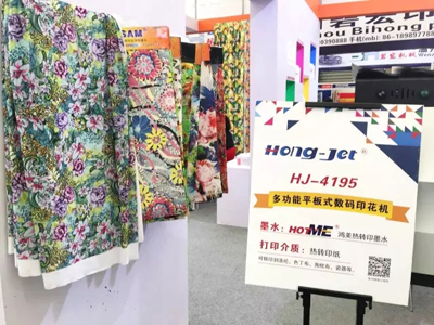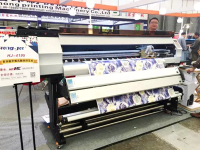 HJ-4195工業級高速紡織數碼印花機配合“鴻美”熱轉印墨水,機器采用工業級壓電5113雙噴頭,高速、高精度打印,生產模式2PASS,速度可達70㎡/h,適用于服裝、泳裝印花,床品布藝以及匹布印花等。HJ-4195生產效率高,噴頭成本低,設備成本低,可大幅降低生產成本。