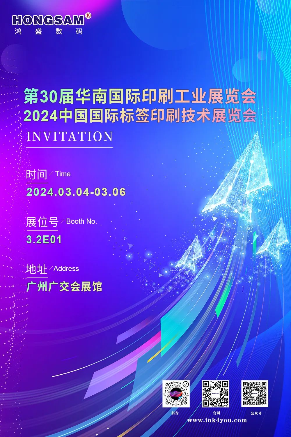 2024年3月4日-6日,第三十屆華南國(guó)際印刷工業(yè)展覽會(huì)&2024中國(guó)國(guó)際標(biāo)簽印刷技術(shù)展覽會(huì)即將在廣州盛大開(kāi)展,鴻盛數(shù)碼如約參展,展位號(hào)為3.2E01,誠(chéng)邀您的蒞臨!