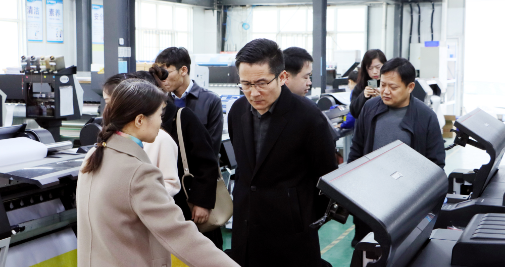 由河南省社會科學院數字經濟與工業經濟研究所副所長趙西三、助理研究員韓樹宇、尚思寧、牛雪妍、鄭州市中小企業服務中心副主任張晏端、經濟運行科科長楊峰組成的調研第一小組,首站選擇高新區3家企業進行調研。在高新區工信辦主任高哲、韓君慰的陪同下,調研組深入鴻盛數碼生產測試一線,調研了企業產品、品質管控、人才引育留用、國際市場拓展等情況,對鴻盛數碼的產品表示贊嘆,并且一致認為,鴻盛數碼水性環保噴墨打印墨水應用產生的社會和生態環保效益,具有更加深遠的意義,將有力推動傳統印染和印刷行業的產業轉型和技術升級,促進國家“雙碳”目標的實現。