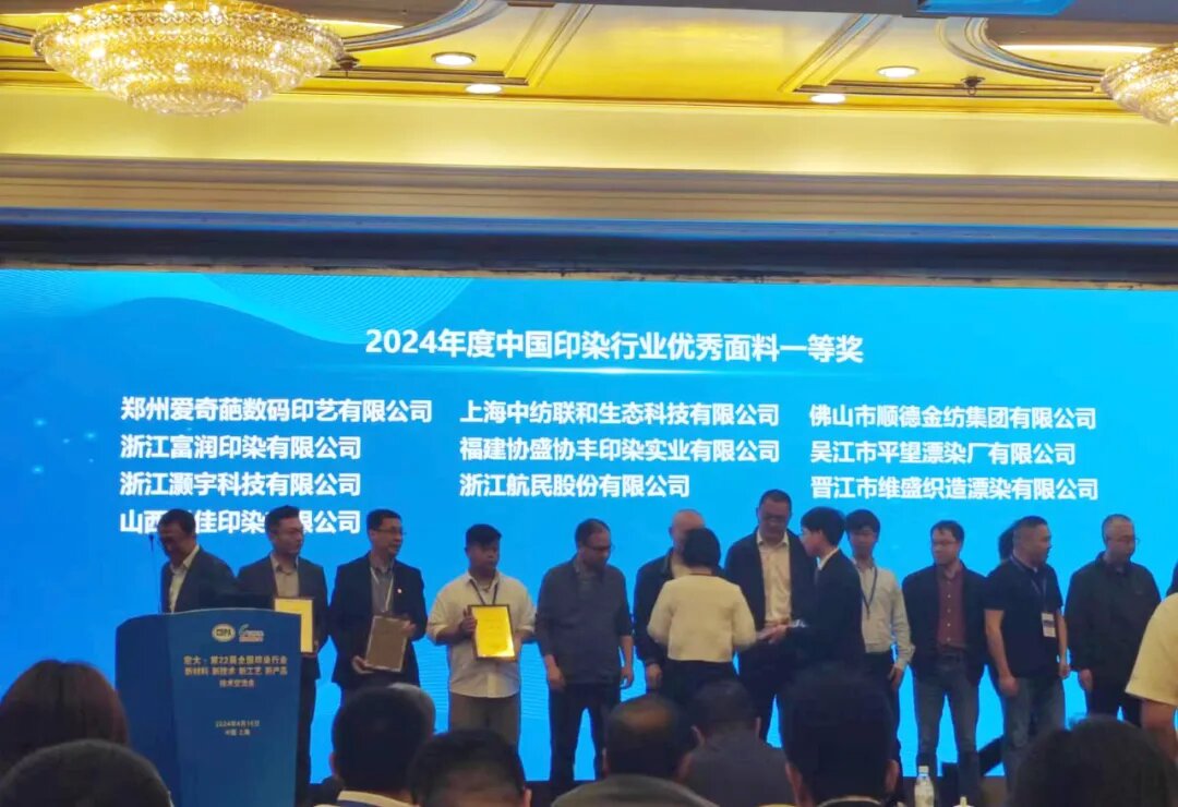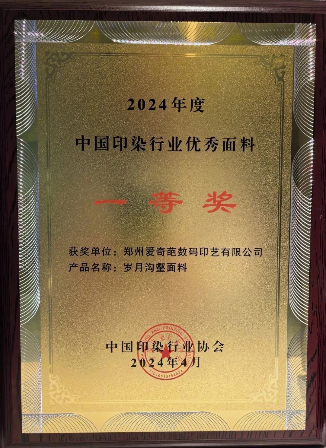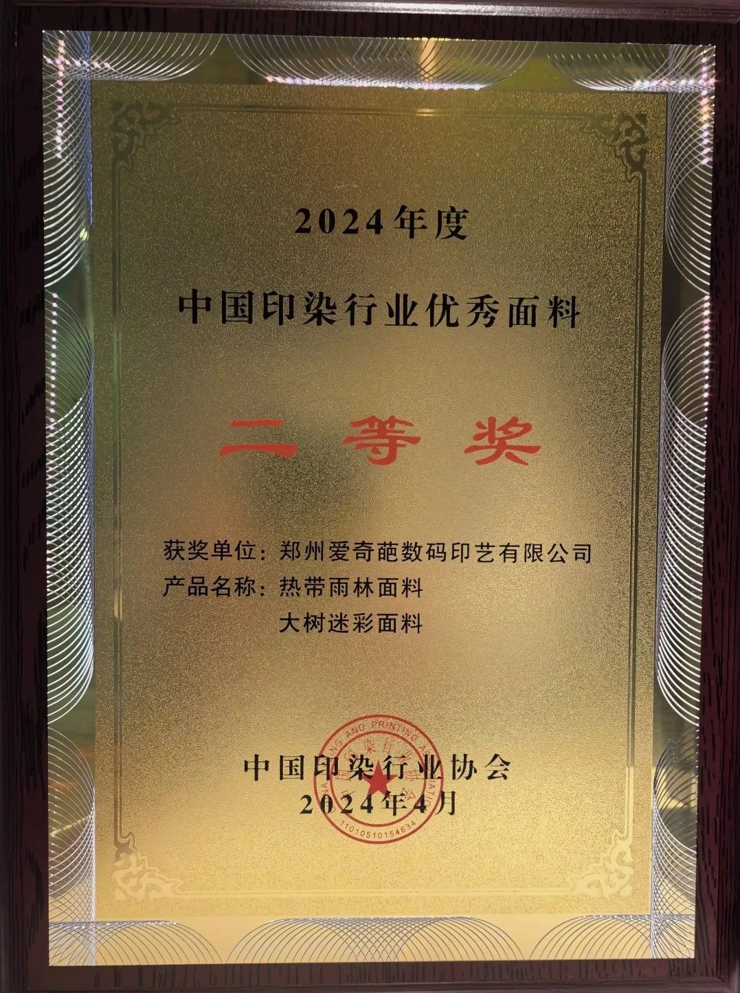 大會宣布了 《關于發(fā)布2024 年度中國印染行業(yè)優(yōu)秀面料獲選產品及企業(yè)名單的決定》,愛奇葩“歲月溝壑”面料榮獲2024年度中國印染行業(yè)優(yōu)秀面料一等獎,“熱帶雨林”面料、“大樹迷彩”面料榮獲二等獎。