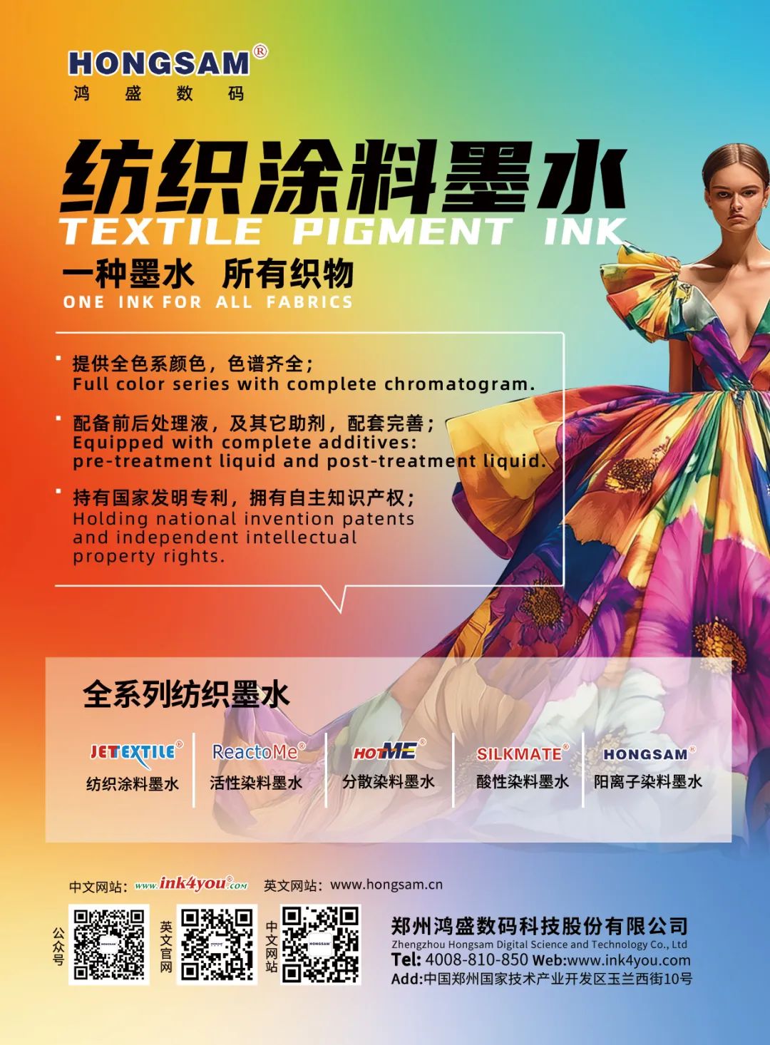 鴻盛數碼深耕噴墨行業23年,鴻盛數碼紡織品數碼印花全系列墨水中“捷特絲®”紡織涂料墨水具有優異的色彩表現、色彩飽和度高、色域寬廣、流暢性好、對噴頭安全性好,持續打印性能優異、安全環保等特點,擁有獨立知識產權(早在2005年就獲得國家發明專利),是噴墨行業涂料印花標準制定者,2016年入選《中國印染協會第十批節能減排先進技術目錄》,有OEKO-TEX機構的ECO PASSPORT(環保通行證)。同時,鴻盛數碼在數碼印花領域還有:鴻美®分散染料墨水、銳美®活性染料墨水、絲美特®酸性染料墨水、鴻盛®陽離子染料墨水,以及各種不同的印花助劑,可以針對各種(含有不同紡織纖維成分)紡織品,提供不同的產品與印花方案!經過二十余年的行業深耕,鴻盛紡織系列墨水遠銷國內外120+國家和地區,為廣大合作企業提供了優質的產品與服務!