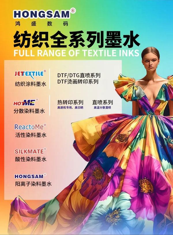 本次展會,鴻盛數碼將重點展示捷特絲®紡織涂料墨水、鴻美®分散染料墨水、高溫分散染料墨水,銳美®活性染料墨水等。滿足織物直噴、熱轉印、燙畫等多元需求,兼具高色牢度與環保性能,助力傳統印花的數字化轉型。