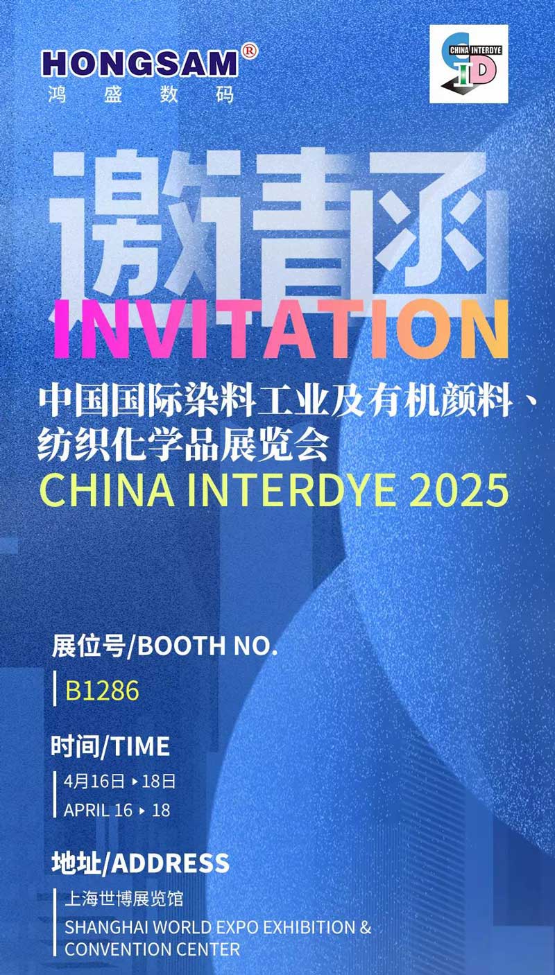 2025 年 4 月 16 日 - 18 日, 2025 中國國際染料工業及有機顏料、紡織化學品展覽會即將在上海世博展覽館盛大啟幕! 作為深耕行業多年的數碼紡織印花墨水企業, 鴻盛數碼此次攜前沿技術與解決方案亮相, 展位號:B1286, 誠邀您共赴行業盛會,探索環保產能與數碼印花的無限可能!