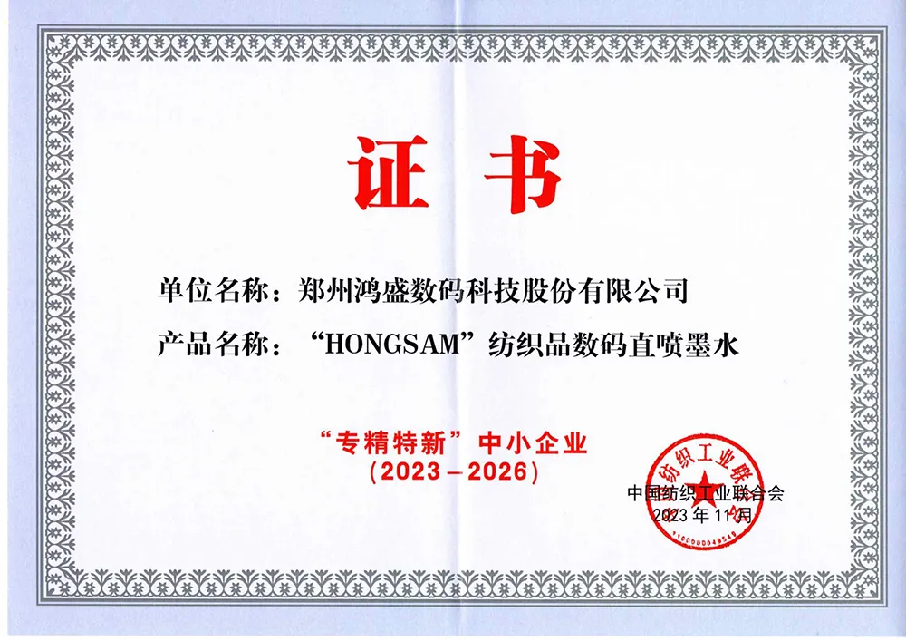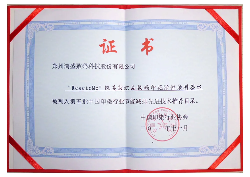 ?2021年,鴻盛數碼和鄭州大學合作的“數碼噴印墨水制備關鍵技術及其應用”項目榮獲“中國紡織工業聯合會科技進步二等獎”
