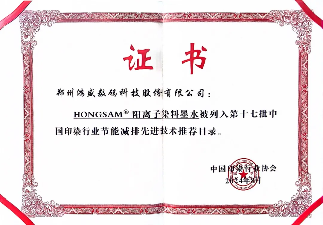 ?2024年,“HONGSAM®陽離子染料墨水”入選第十七批中國印染行業(yè)節(jié)能減排先進(jìn)技術(shù)推薦目錄